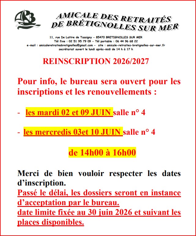 Vous trouverez ci-dessous les documents concernant la réinscription à l’Amicale pour 2026/2027.