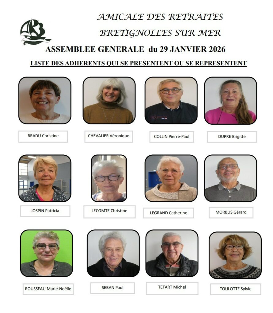 Assemblée Générale 2026, jeudi 29 Janvier, salle des fêtes, Brétignolles sur Mer.